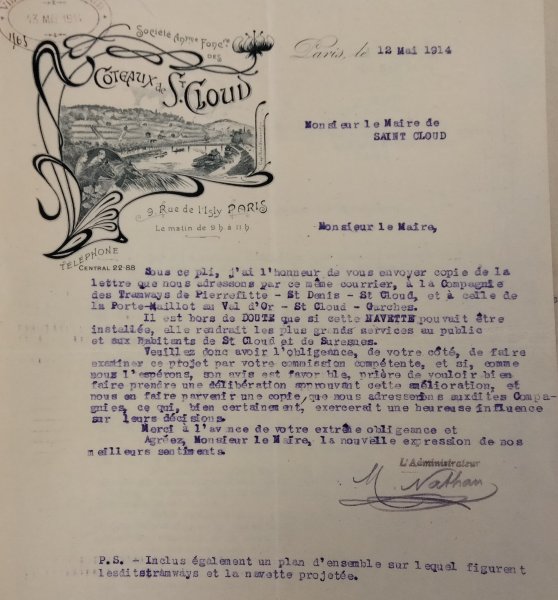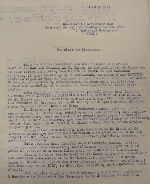 Saint-Cloud écrit au Directeur de tramways du Bois de Boulogne au Val-d'Or, 75